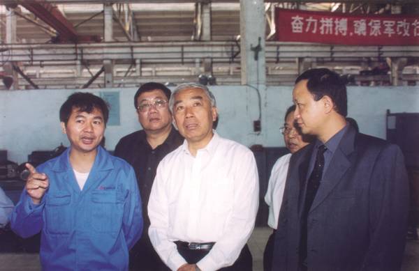 7、2001年4月11日,時(shí)任國(guó)防科工委主任劉積斌(前排左4)在省國(guó)防工辦主任李賢書(shū)的陪同下來(lái)廠調(diào)研