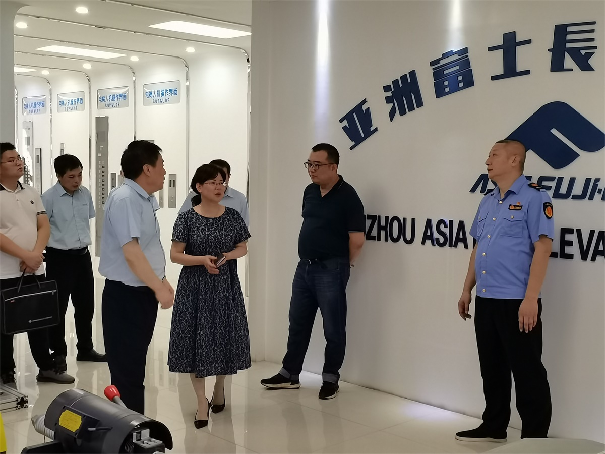 譚副局長和市局領導參觀了公司的展廳、生產車間,乘座了公司自主開發的6米/秒高速消防電梯和觀光梯。