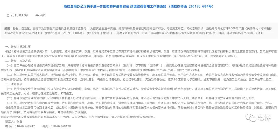 問:電梯安裝人員需要什么證件,總局能否明示? 總局回復:《市場監管總局關于特種設備行政許可有關事項的公告》〔2019年 第3號〕已明確,特種設備作業人員資格認定分類與項目已不包括電梯安裝,電梯安裝人員不需要持市場監管部門頒發的作業人員證。同時,電梯安裝告知應當依據《質檢總局辦公廳關于進一步規范特種設備安裝改造維修告知工作的通知》(質檢辦特函〔2013〕684號)執行。