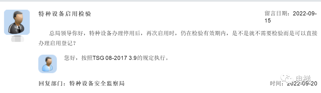 問:特種設備啟用檢驗 總局領導你好,特種設備辦理停用后,再次啟用時,仍在檢驗有效期內(nèi),是不是就不需要檢驗而是可以直接辦理啟用登記? 總局回復:您好,按照TSG 08-2017 3.9的規(guī)定執(zhí)行。