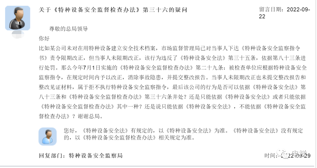 問:關(guān)于《特種設備安全監(jiān)督檢查辦法》第三十六的疑問 尊敬的總局領導 你好 比如某公司未對在用特種設備建立安全技術(shù)檔案,市場監(jiān)督管理局已對當事人下達《特種設備安全監(jiān)察指令書》責令限期改正,但當事人未限期改正,該行為違反了《特種設備安全法》第三十五條,依據(jù)第八十三條進行處罰。那么今年7月1日實施的《特種設備安全監(jiān)督檢查辦法》第二十九條:被檢查單位應根據(jù)特種設備安全監(jiān)察指令,在規(guī)定時間內(nèi)予以改正,消除事故隱患,并提交整改報告。當事人未限期改正也未提交整改報告和整改見證材料,屬于拒不執(zhí)行特種設備安全監(jiān)察指令,最后該公司的行為是否可以依據(jù)《特種設備安全法》第八十三條和《特種設備安全監(jiān)督檢查辦法》第三十六條并處?還是只能依據(jù)《特種設備安全法》或者只能依據(jù)《特種設備安全監(jiān)督檢查辦法》其中一種?還是說只能依據(jù)《特種設備安全法》,不能依據(jù)《特種設備安全監(jiān)督檢查辦法》?謝謝總局。 總局回復:您好,《特種設備安全法》有規(guī)定的,以《特種設備安全法》為準。《特種設備安全法》沒有規(guī)定的,以《特種設備安全監(jiān)督檢查辦法》相關(guān)規(guī)定為準。