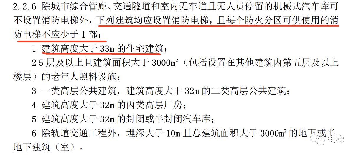 但是建筑行業(yè)都稱這種火災中供消防員使用的電梯叫消防電梯。 可是目前我們絕大多數(超95%以上)的住宅里面安裝的消防電梯或者消防員電梯都不是真正意義上的消防電梯,而是僅僅具備消防迫降功能而已,就是在電梯基站安裝一個消防開關(一般在一個小紅盒子里裝著),該開關動作后電梯就會自動返回基站停止服務,而這種假的“消防電梯”根本不具有真正消防電梯的隔煙防火防水性能。 今年6月1日開始執(zhí)行的《建筑防火通用規(guī)范》(GB55037-2022)中明確規(guī)定了必須配備消防電梯的幾種情況,其中: 高度大于33m的住宅建筑,就必須至少安裝一臺消防電梯。