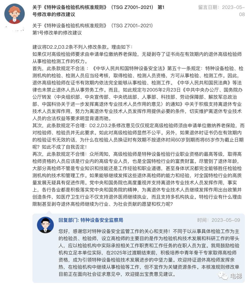 其次,此條款規(guī)定不合理:D2.2,D3.2條修改意見僅僅規(guī)定高級檢驗師須由申請單位繳納養(yǎng)老保險,而對檢驗師、檢驗員并無此要求。如此對高級檢驗師顯然不公平。另外,如果退休時證書仍在有效期內(nèi)的檢驗證書無效的話,為什么在檢驗人員換證時有效期不按退休時間60歲到期而將65歲作為截止日期呢?如此不成了自我否定!