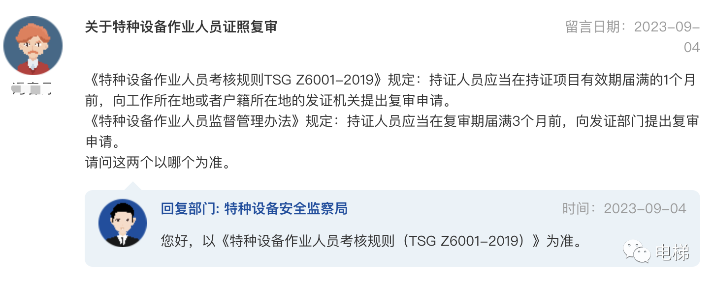 PS:相關鏈接:市場監(jiān)管總局辦公廳關于特種設備檢驗人員考核等有關事項的通知》(市監(jiān)特設發(fā)〔2022〕93號 ![]() 問:關于特種設備作業(yè)人員證照復審 《特種設備作業(yè)人員考核規(guī)則TSG Z6001-2019》規(guī)定:持證人員應當在持證項目有效期屆滿的1個月前,向工作所在地或者戶籍所在地的發(fā)證機關提出復審申請。 總局回復:您好,以《特種設備作業(yè)人員考核規(guī)則(TSG Z6001-2019)》為準。