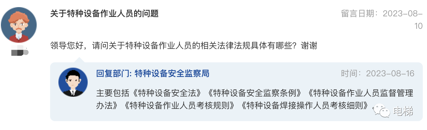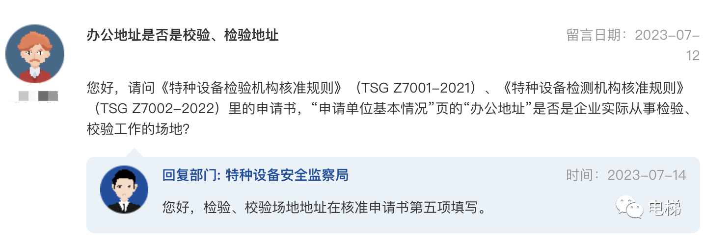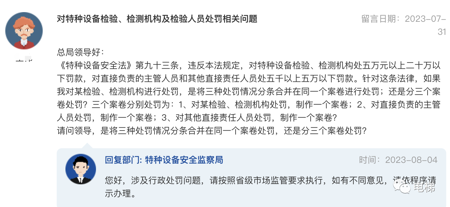 問:總局74號令中關于電梯安全員是否需要電梯管理員證 總局74號《特種設備使用單位落實使用安全主體責任監(jiān)督管理規(guī)定》中第六章電梯中,要求電梯使用單位設立電梯安全員,對電梯安全員的工作職責進行了明確。想向貴局咨詢下,電梯安全員是否有強制資質要求,是否必須要有特種設備作業(yè)人員證中的電梯管理員證書,謝謝。 總局回復:謝謝您的提問!一是關于安全總監(jiān)和安全員的具體實施要求,請查閱《市場監(jiān)管總局辦公廳關于開展“特種設備企業(yè)主體責任推進年”活動的通知》(市監(jiān)特設發(fā)〔2023〕33號)附件的《關于實施兩個規(guī)定若干問題的說明》。二是相應電梯安全管理員配備相關要求(專職或兼職),請查閱《特種設備使用管理規(guī)則》(TSG 08-2017)第2.4.2.2.2項。同時,依據(jù)《質檢總局辦公廳關于實施<特種設備使用管理規(guī)則>中若干問題的通知》(質檢辦特函〔2017〕1015號),使用單位配備的兼職安全管理人員不要求取得特種設備安全管理人員資格證書。 ![]() 總局領導好: 總局回復:您好,涉及行政處罰問題,請按照省級市場監(jiān)管要求執(zhí)行,如有不同意見,請依程序請示辦理。