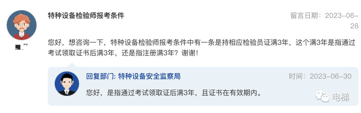 問:辦公地址是否是校驗、檢驗地址 您好,請問《特種設備檢驗機構核準規(guī)則》(TSG Z7001-2021)、《特種設備檢測機構核準規(guī)則》(TSG Z7002-2022)里的申請書,“申請單位基本情況”頁的“辦公地址”是否是企業(yè)實際從事檢驗、校驗工作的場地? 總局回復:您好,檢驗、校驗場地地址在核準申請書第五項填寫。 ![]() 問題:特種設備檢驗師報考條件 您好,想咨詢一下,特種設備檢驗師報考條件中有一條是持相應檢驗員證滿3年,這個滿3年是指通過考試領取證書后滿3年,還是指注冊滿3年?謝謝! 總局回復:您好,是指通過考試領取證后滿3年,且證書在有效期內。