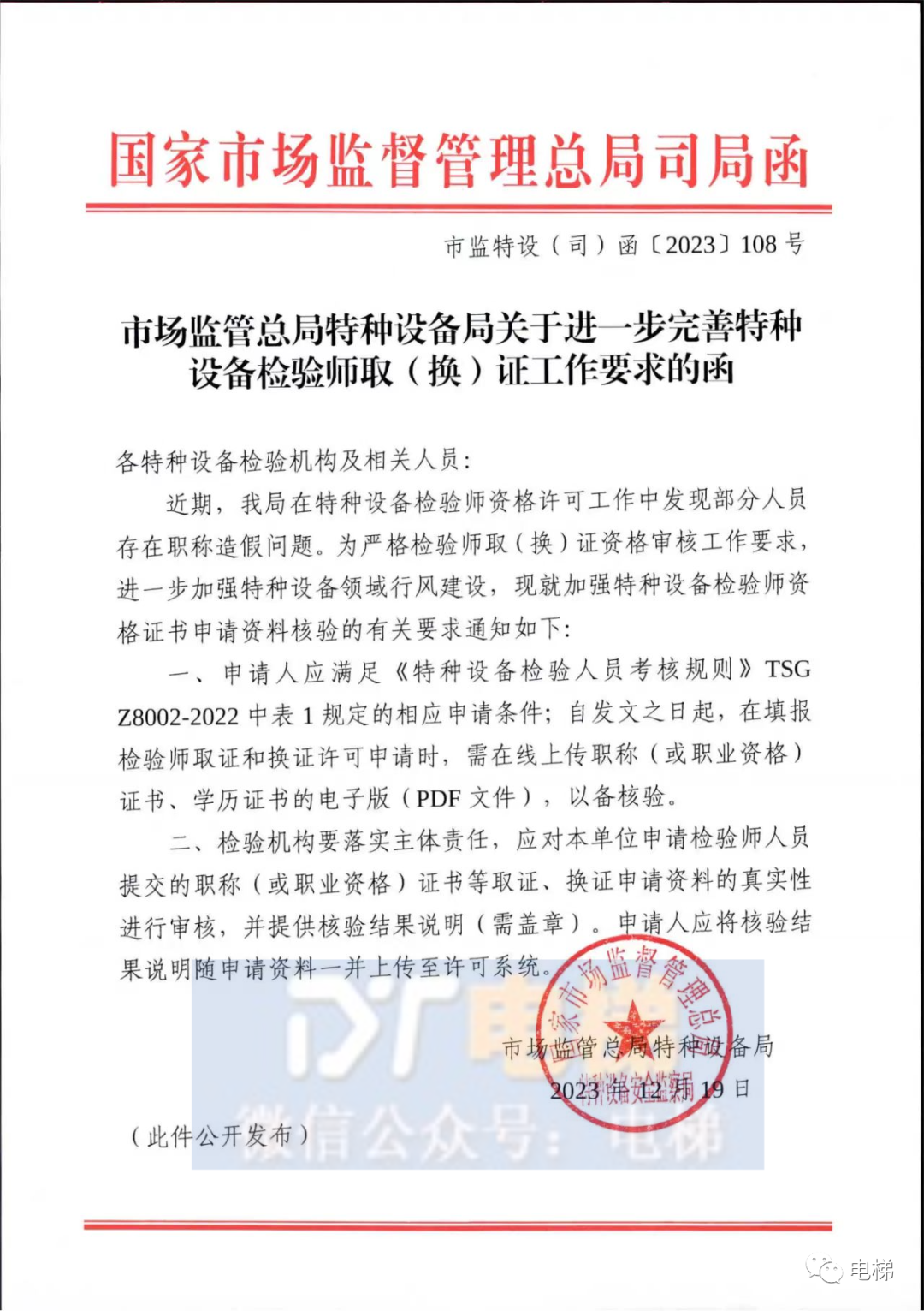 總局:完善電梯檢驗師取(換)證工作要求函!
